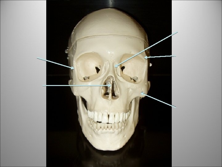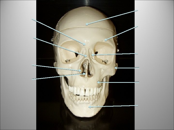 Frontal bone Glabella Supraorbital foramen Nasal bones Lacrimal bone Inferior nasal conchae Vomer Zygomatic bone Maxilla Mandible