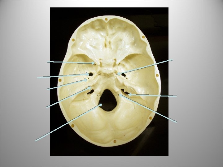 Optic Canal Foramen rotundum Foramen lacerum Foramen ovale Foramen spinosum Jugular foramen Internal acoustic (auditory) meatus Hypoglossal canal Foramen magnum