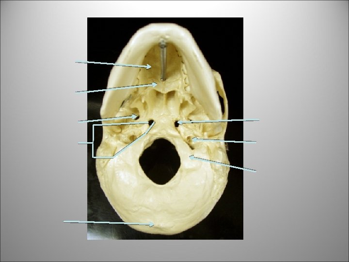 Palatine process of maxilla Palatine bone Foramen lacerum Petrous region of the temporal bone Carotid canal Jugular foramen Occipital condyle External occipital protuberance