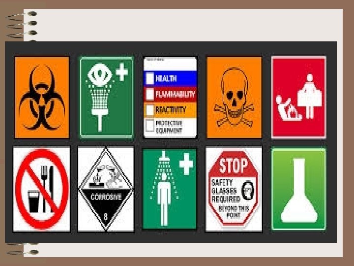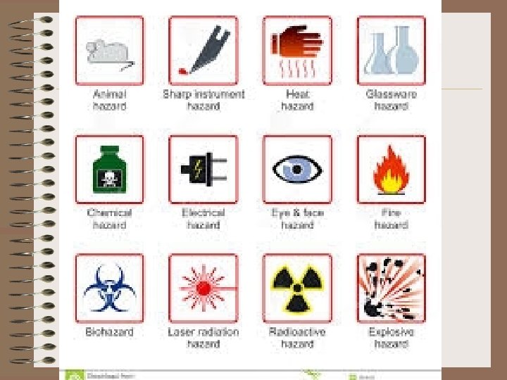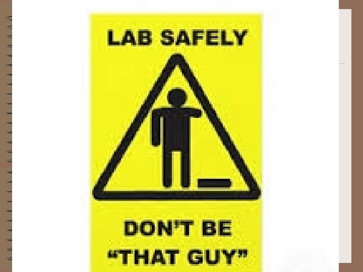 Lab Safety Picture • • Lab Rule: no eating, wash hands, etc Sharp Object Fire Hazard Chemical Hazard Fire Extinguisher Wear Goggles Wear Gloves Electrical Hazard