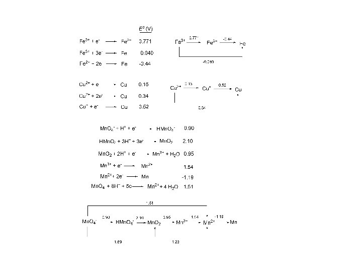 Fe(phen)33+ + e Fe(H 2 O)62+ Eo = 0. 77 V Fe(CN)63 + e Fe(CN)64 Eo = 0. 36 V Heme(Fe 3+) + e Heme(Fe 2+) Eo = 0. 17 V Fe(III)cyt-c + e- Fe(II)cyt-c Eo = 0. 126 V Fe(phen)32+ Eo = 1. 14 V
