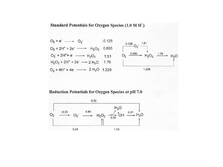Dependence of Reduction Potential on p. H O 2 + 4 H + + 4 e - 2 H 2 O Eo = 1. 23 V (1. 0 M H+) E = 0. 82 V (p. H 7)