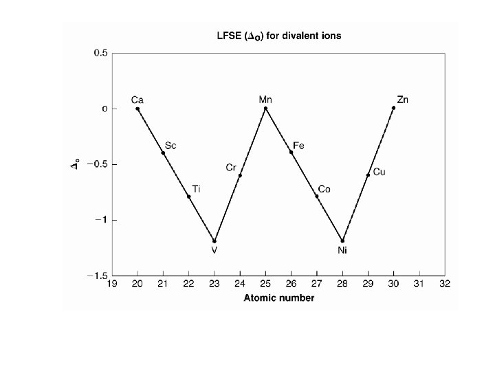 dn LFSE ( o) Mn 2+ d 5 0 Fe 2+ d 6 2/5 Co 2+ d 7 4/5 Ni 2+ d 8 6/5 Cu 2+ d 9 3/5 Zn 2+ d 10 0