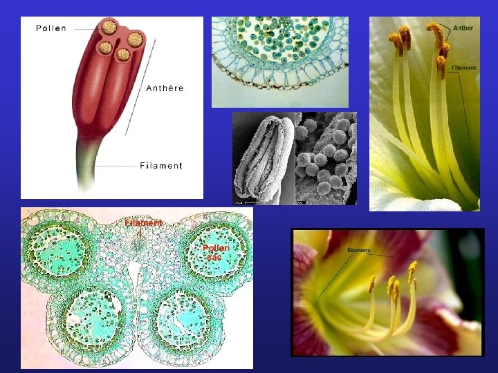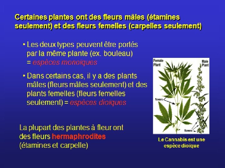 Campbell p. 659 La fleur Partie femelle = Pistil • Stigmate • Style • Ovaire L'ovaire contient un ou plusieurs ovules. Partie mâle = Étamines • Anthères : contiennent les grains de pollen • Filet