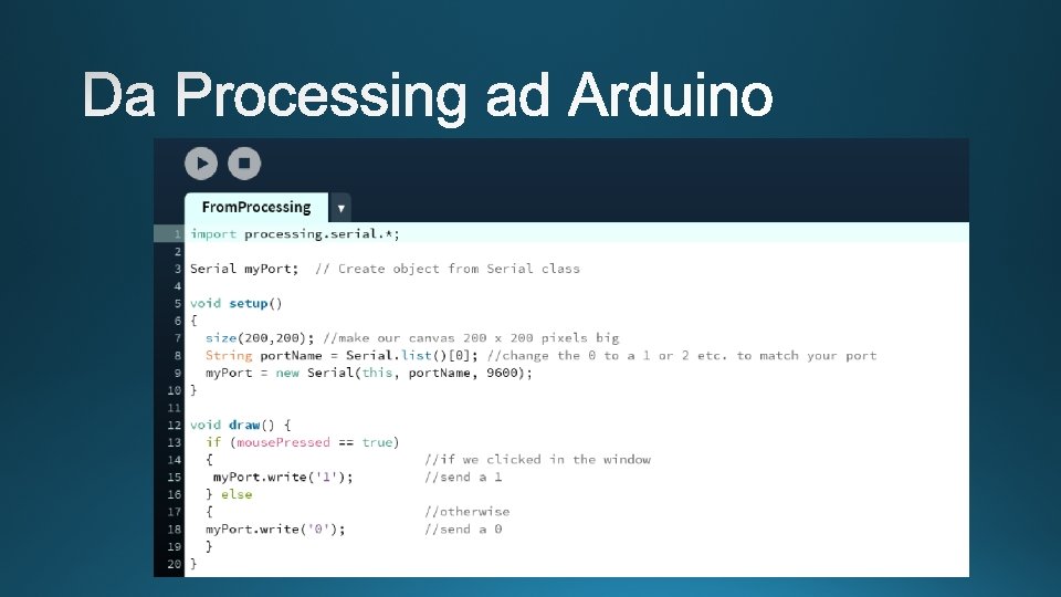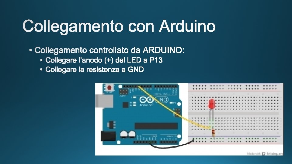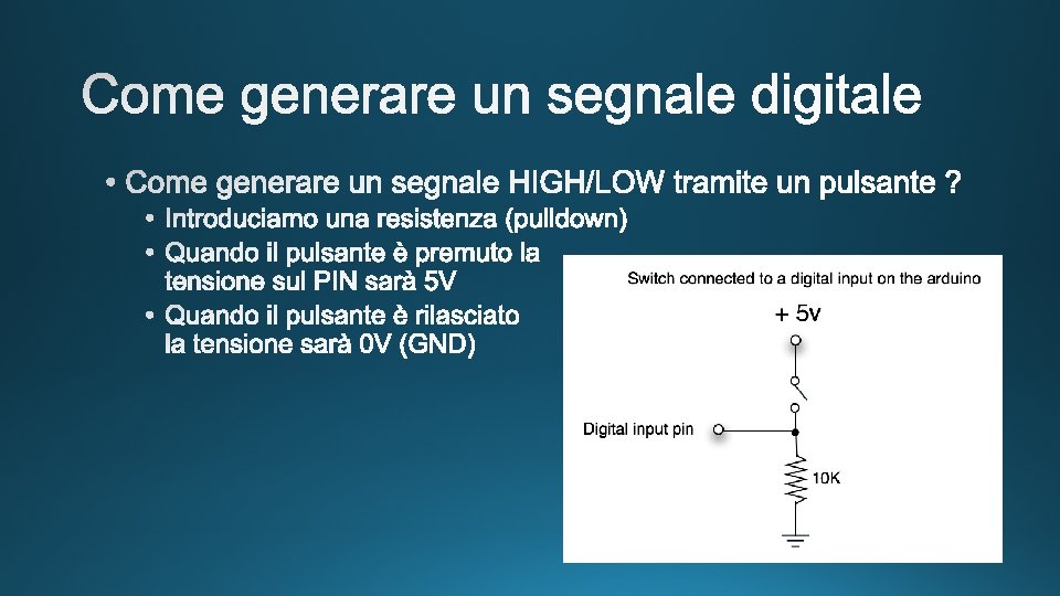 const int LED = 9; const int BUTTON = 7; int stato; void setup() { pin. Mode(LED, OUTPUT); pin. Mode(BUTTON, INPUT); } void loop() { stato=digital. Read(BUTTON); if (stato==1) {digital. Write(LED, HIGH); } else {digital. Write(LED, LOW ); } }