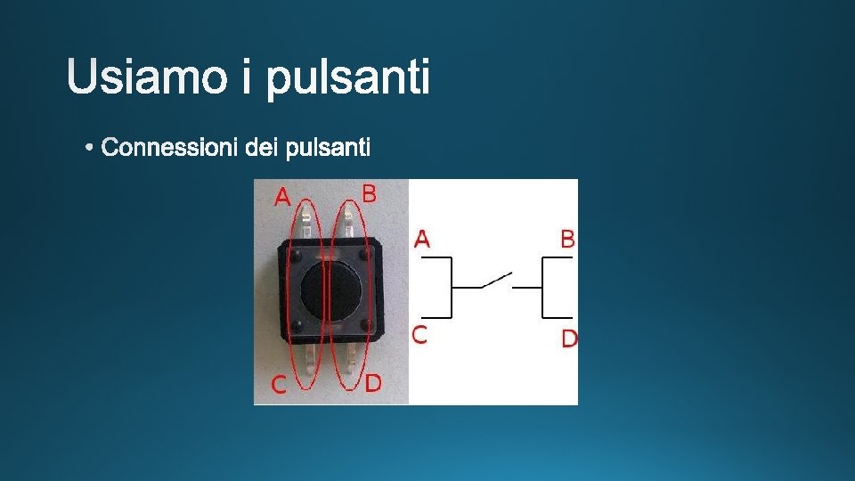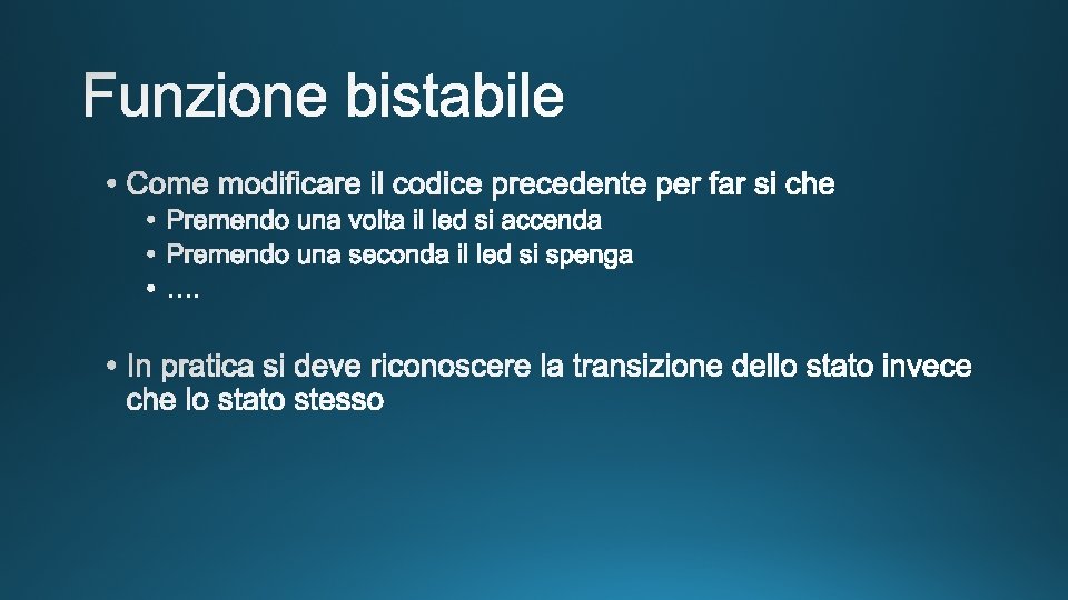 … int stato_attuale, stato_passato; int luce; void setup() { … luce=0; } void loop() { stato_attuale=digital. Read(BUTTON); if ((stato_attuale-stato_passato)==1) {luce=1 -luce; } digital. Write(LED, luce); stato_passato=stato_attuale ; }