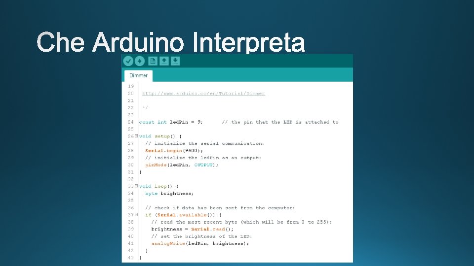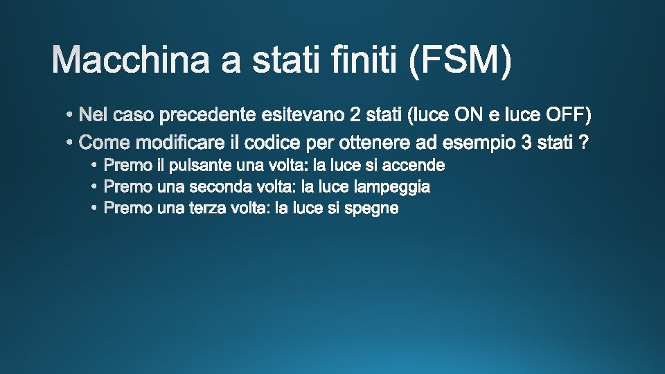 const int LED = 9; const int BUTTON = 7; int pulsante_attuale, pulsante_passato, stato, luce; void setup() { pin. Mode(LED, OUTPUT); pin. Mode(BUTTON, INPUT); stato=0; } void loop() { pulsante_attuale=digital. Read(BUTTON); if ((pulsante_attuale-pulsante_passato)==1) stato=stato+1; if (stato==3) stato=0; if (stato==0) {luce=0; } if (stato==1) {luce=64; } if (stato==2) {luce=255; } analog. Write(LED, luce); pulsante_passato=pulsante_attuale; }