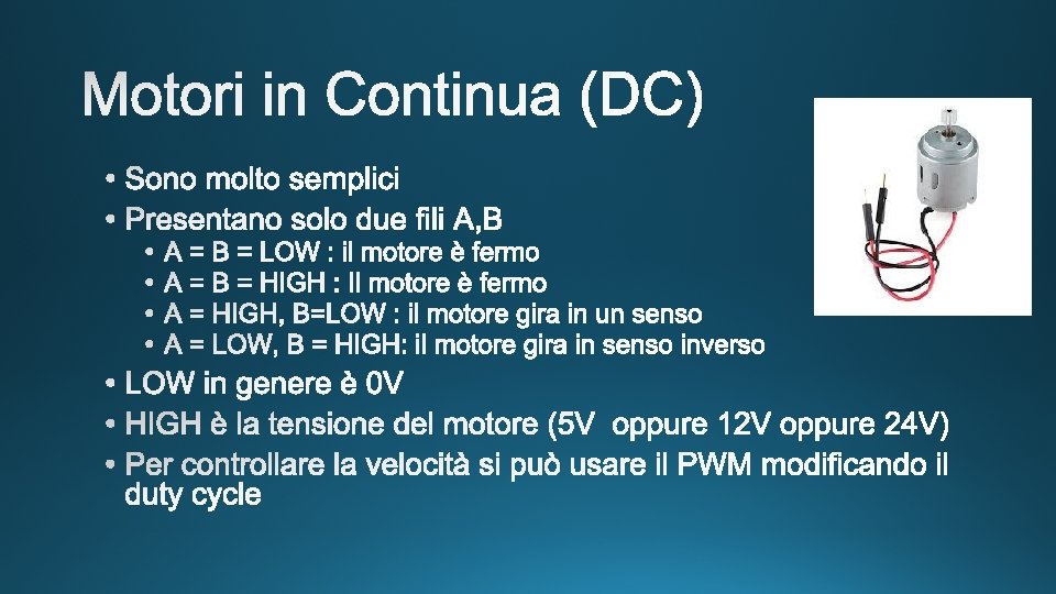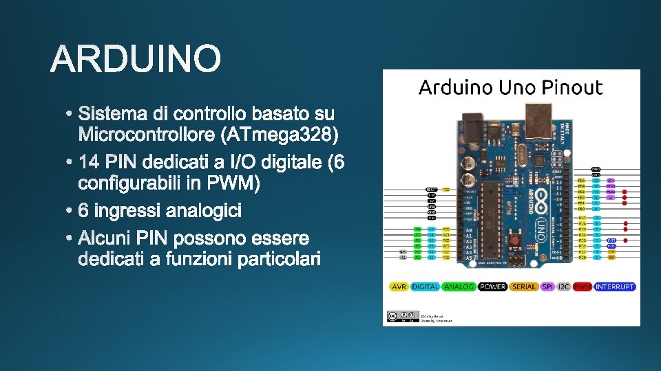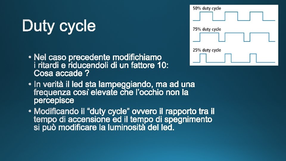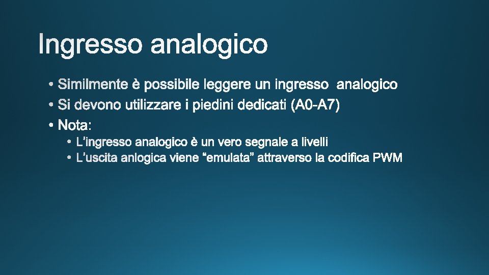• Diverse ampiezze vengono codificate con un duty cycle proporzionale • L’ambiente Arduino lo tutto ciò fa automaticamente con la funzione Analogwrite (solo per i pin “~”) • Il valore in ingresso va da 0 (spento) a 255 (acceso) ES: analog. Write(LED, 128) • Modifichiamo il codice precedente per accendere il LED a diverse intensità sfruttando questa funzione Nota: si possono modificare le proprietà del PWM agendo sui registri interni del Controllore