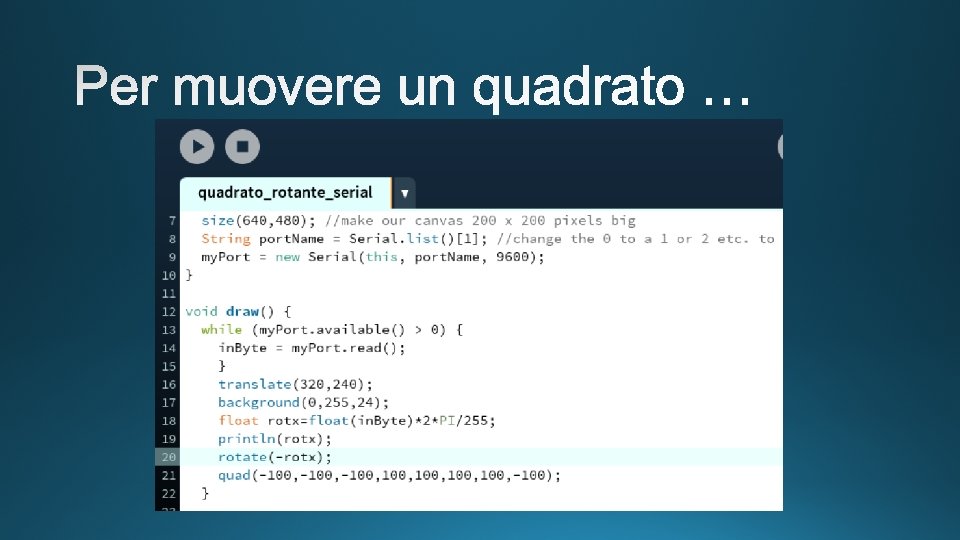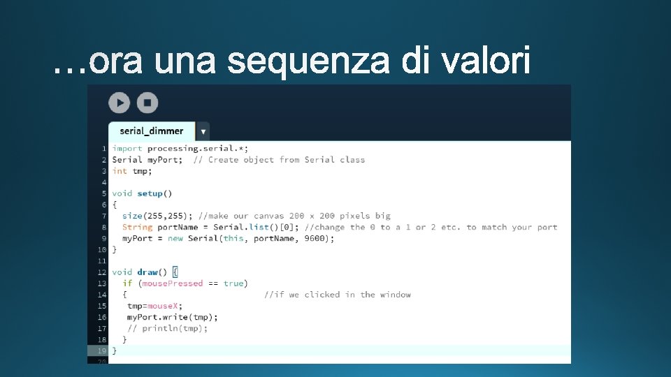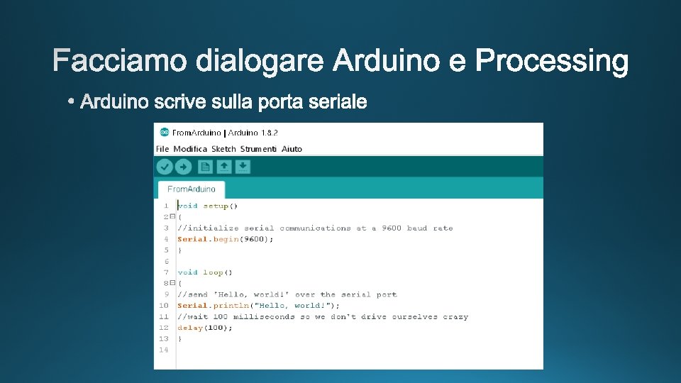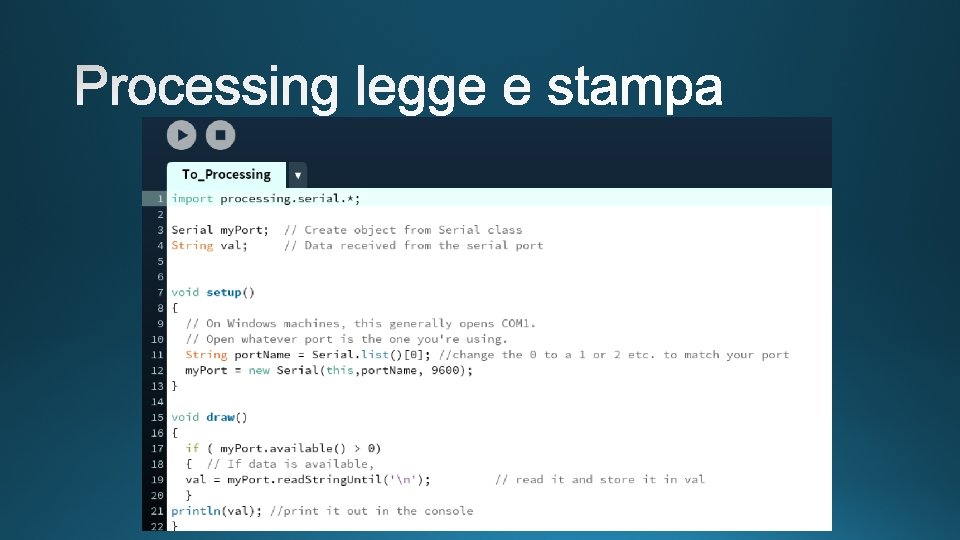 void setup() { Serial. begin(9600); // inizializzazione } void loop() { Serial. println(val); } // visualizzazione