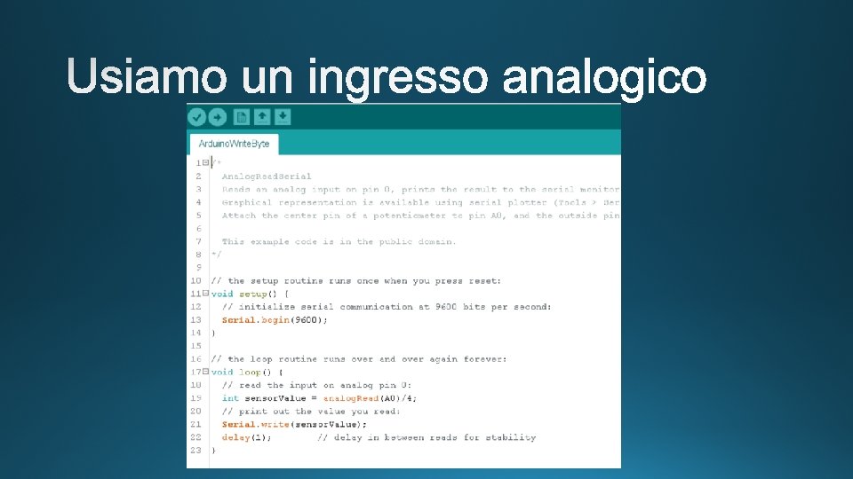 int analog. Pin = 0; int val = 0; void setup() { Serial. begin(9600); } void loop() { val = analog. Read(analog. Pin); Serial. println(val); }