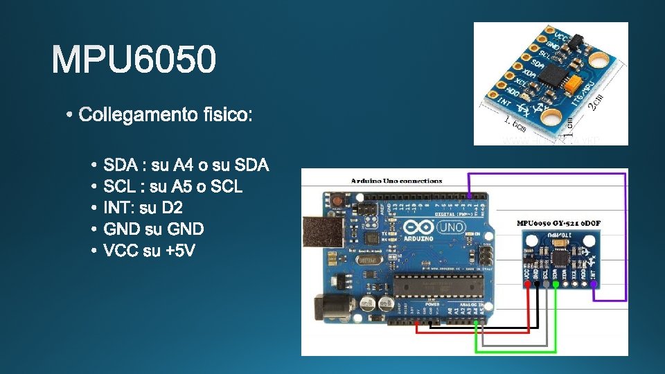 I_MPU 6050 To. Processing. ino NOTA BENE: Commentare o togliere il commento dalla riga opportuna #define OUTPUT_READABLE_YAWPITCHROLL // #define OUTPUT_TEAPOT // #define OUTPUT_BYTE_YAWPITCHROLL MPU 6050 I 2 Cdev