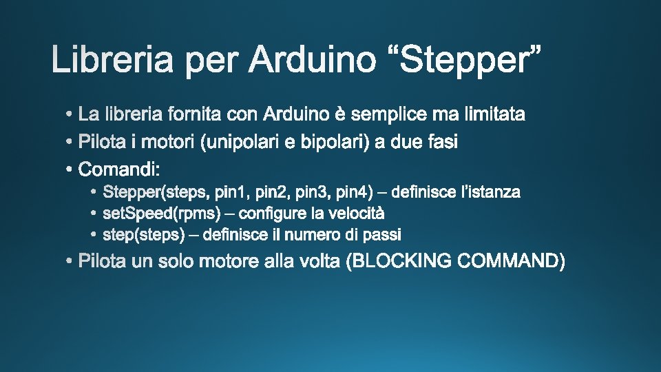 • • set. Max. Speed set. Acceleration set. Speed (float speed) move. To distance. To. Go () current. Position () stop () run Ulteriori informazioni: