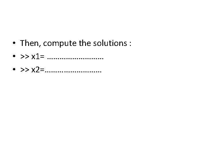 • Using the commands window, enter the following commands : • First use assignment statements to define the coefficients a, b, and c • >> a=…… ; • >> b=……; • >> c=……;