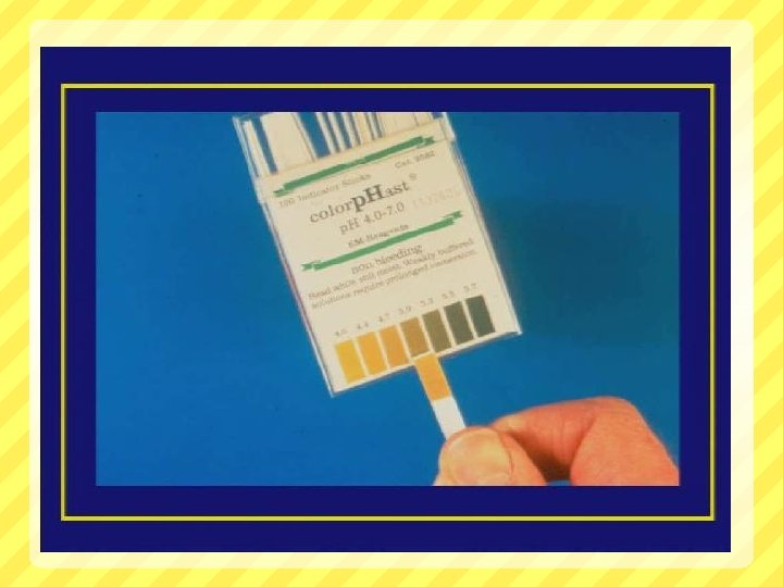 PH TEST PH indicator strips: p. H 3. 5 - 7. 0 Place sample of vaginal secretion on test strip: read while still moist. PH>4. 5 indicates abnormality (i. e. BVTrichomonas- or menstrual blood). Be careful not to sample the cervix; cervical secretions and blood have a PH 7. 0
