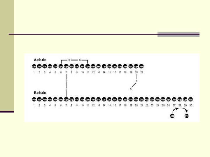 Insulin n Molecular weight of this peptic substance is 6000. n It consists of 51 aminoacidic parts from 16 different aminoacids n The most important biologic stimulator of insulin secretion is glucose