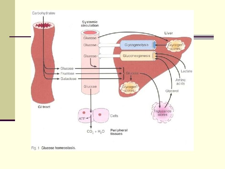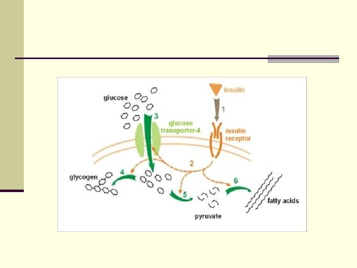 The effects of insulin on carbohydrate metabolism n stimulation of glucose transport across muscle and adipose cell membranes; n regulation of hepatic glycogen synthesis; n inhibition of glucose formation – from glycogen (glycogenolysis) and – from aminoacid precursors (glyconeogenesis). n The result of these actions is a reduction in blood glucose concentration.