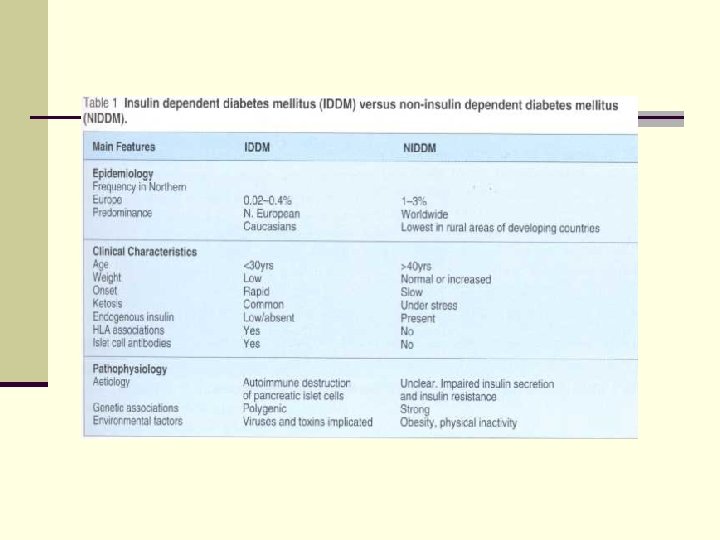 Epidemiology n About 2 to 4 % of the world population is affected with DM n The disease is more common: - in persons after age 45 in obese individuals in certain ethnic groups in those with a positive family history of DM n In patients with type 1 DM, complications from end stage renal disease are major cause of death, whereas patients with type 2 diabetes are more likely to have macrovascular diseases leading to myocardial infarction and stroke as main causes of the death