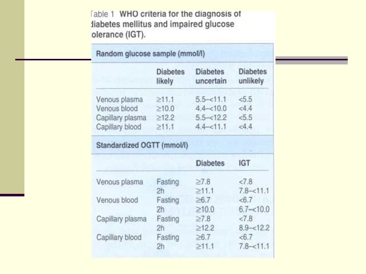 Glucose tolerance test (GTT) Fasting serum glucose, mmol/l 2 hours after glucose loading, mmol/l Capillary blood Health 3, 3 – 5, 5 <7, 8 Impaired glucose tolerance 5, 6 – 6, 1 7, 8 – 11, 1 Diabetes mellitus > 6, 1 > 11, 1 Impaired fast glucose tolerance 5, 6 – 6, 1 < 7, 8