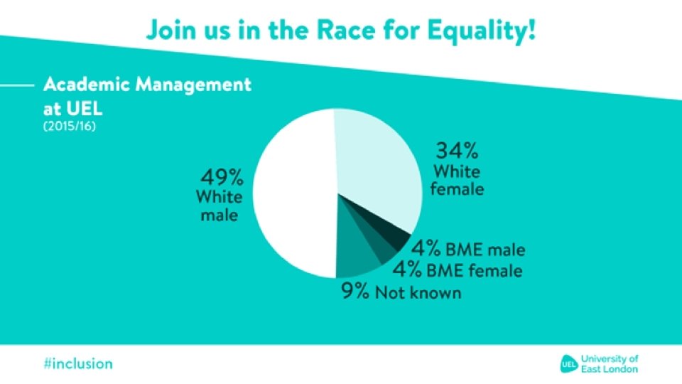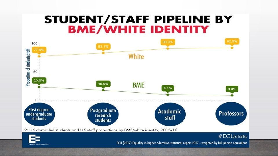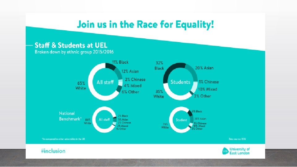 Staff & student perspectives • Lack of HE role models representing all ethnic groups 87% • Lack of diverse senior leaders 78% • Curriculum delivery 82% • Lower socioeconomic background 75% • Lack of diversity of ethnicity among senior staff 79% • Institutional culture and leadership 72% • Curriculum design 77% • Lack of role models 72%