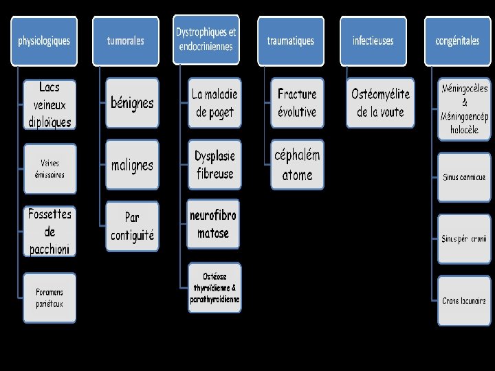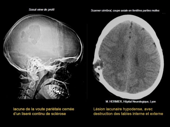 Généralités • Lacune crânienne: Baisse de densité osseuse d’une ou des trois couches de la voûte du crâne ( calvaria) • Radioclarté osseuse: – Image de défect (absence des tables interne, externe et du diploé), – Zone d’amincissement (absence d’une seule table) – ou déminéralisation localisée.
