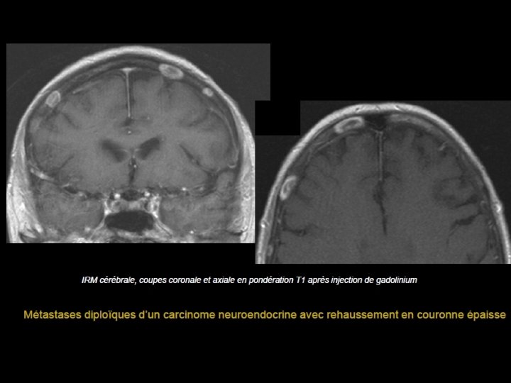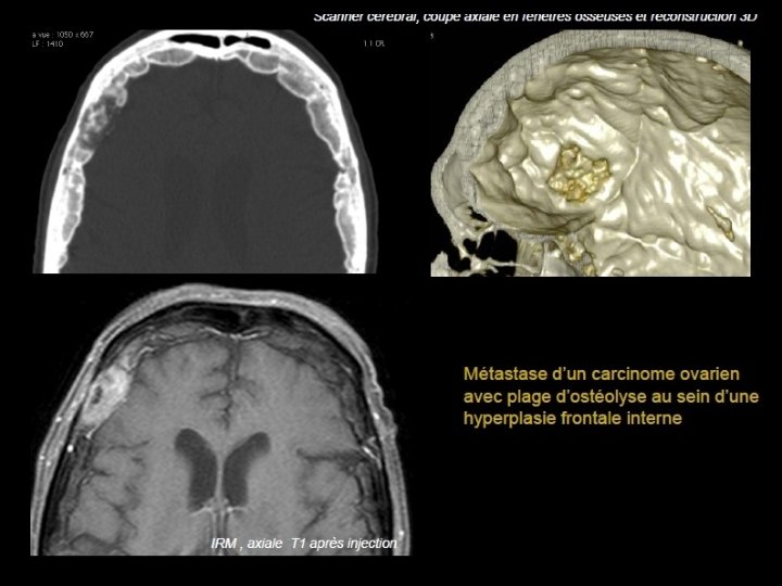 • Scanner: - Plus volontiers lacunaires que condensantes. - Initialement diploïques - Destruction secondaire des tables interne et externe - Envahissement des parties molles et de l’espace épidural • IRM - T 1: Hypo ou isosignal effaçant l’hypersignal habituel du diploé, - T 2: Hypersignal - Prise de contraste.