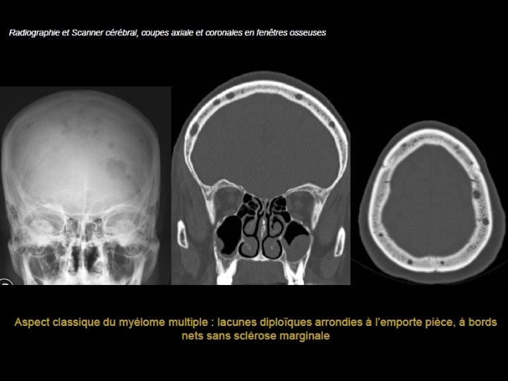 Myélome multiple • Atteinte de la voûte dans 50 % des myélomes • Scanner et radiographie standard: - Lacunes diploïques arrondies à l’emporte pièce de contours nets sans sclérose marginale, réparties de manière uniforme - Taille homogène, 3 à 15 mm - Extension secondaire aux tables - Os adjacent ostéoporotique