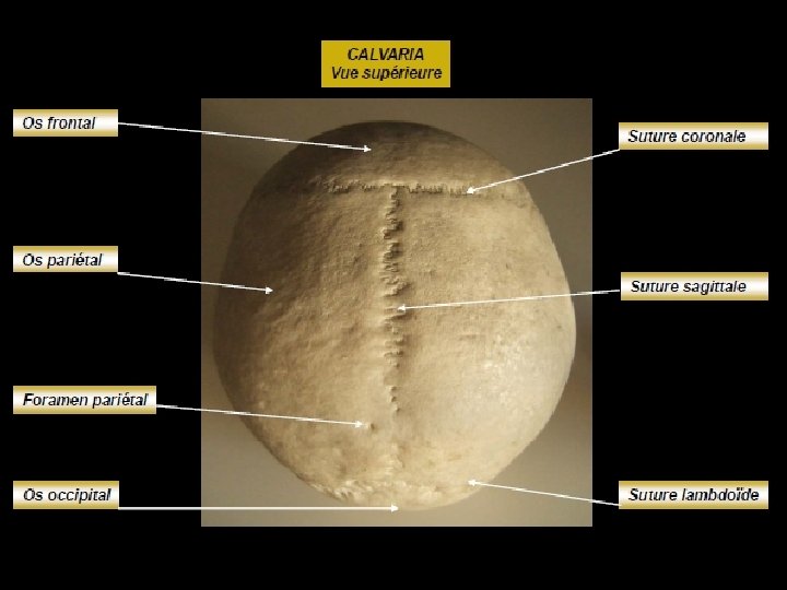 Rappel anatomique • Le crâne est constitué d’os plats: -L’os frontal -Les os pariétaux -L’os occipital -Les écailles temporales, -une parties des grandes ailes du sphénoïde et des arcades zygomatiques.