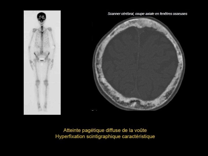 Scanner: • très bonne analyse des remaniements dystrophiques - Épaississement de la voûte - Dédifférenciation tables / diploé - Aspect en tâches de bougie de la table externe IRM • en pondération T 2 avec suppression du signal de la graisse - localiser les zones actives qui apparaissent en hypersignal (front d’ostéolyse) Douleur ou l’apparition d’une tuméfaction dégénérescence sarcomateuse+++