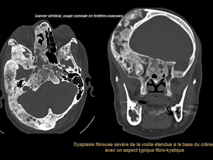 Dysplasie fibreuse • • - Remplacement de l’os normal par du tissu fibreux. Adultes jeunes. Atteinte généralement hémi crânienne. Atteinte focalisée possible: tropisme pour l’os frontal. Dégénérescence maligne rare (0, 4 % à 4% des cas). Association aux kystes anévrismaux 3 types Condensante (opacités en verre dépoli). Kystique Mixte