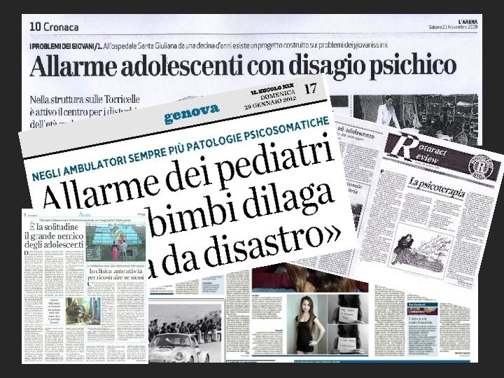 Adolescenti e somatizzazione il corpo gioca in adolescenza un ruolo centrale IL CORPO CHE CAMBIA (lutto del corpo bambino; passaggio del concetto di sé costruito sull’opinione dei genitori al concetto di sé ricavato dal giudizio dei coetanei) • • IL CORPO SESSUATO (nuove pulsioni e desideri spingono all’esterno della famiglia; una svalorizzazione temporanea dei genitori facilita