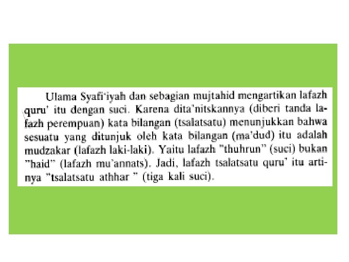 Mutasyabbih q lafazh yang shighatnya sendiri tidak menunjukkan kepada makna yang dikehendaki , q tidak didapati pula qarinah-qarinah dari luar yang menjelaskannya. q Syari‘ sendiri memandang tidak perlu diketahui orang, maka tidak dijelaskannya.