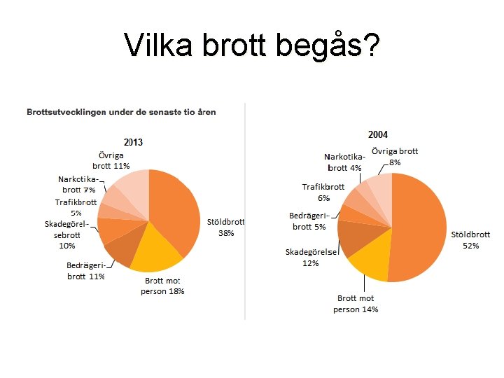 Våldsbrott Enligt undersökningar som görs varje år så uppger 5 -6% av de vuxna i Sverige att de blivit utsatta för våld eller hot. ¼ av de svenska hushållen utsätts varje år för stöld eller skadegörelse Ca 2% har blivit utsatta för allvarligare brott som har lett till synliga märken eller kroppsskada. 10 -15% känner sig oroliga för att bli utsatta och väljer t. ex att inte gå ut under vissa tider.