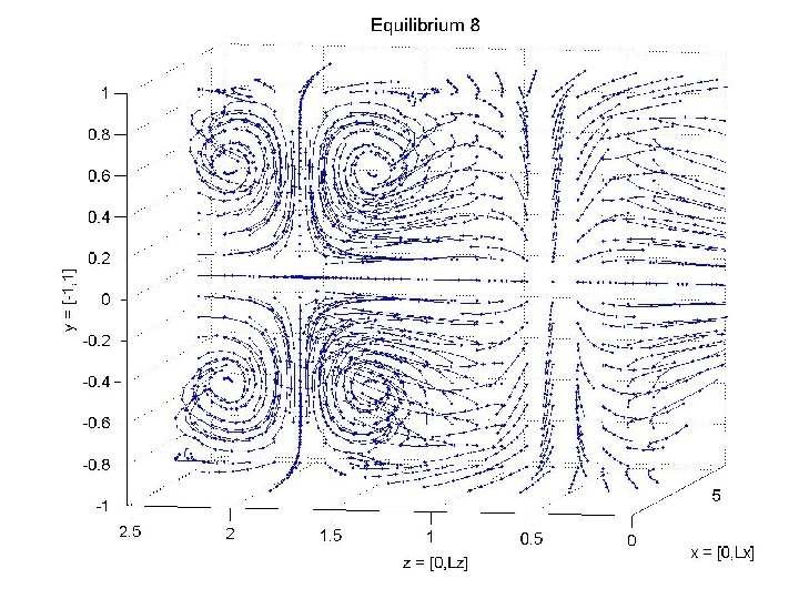 • Lagrangian chaos leads to the possibility of efficient mixing at low Re numbers and to a better understanding of turbulent mixing when diffusivity is small • This motivates the study of the paths of tracer particles in a fixed velocity field. Most naturally, start with an equilibrium velocity field. • We wish to study the way in which invariant surfaces within the fluid provide a boundary for all tracer particles and define regions within the fluid where the most efficient mixing occurs. • Applying this analysis to plane Couette flow should lead to a novel description and understanding of the ways in which mixing may occur in turbulent shear flows • Initial progress has been made with the discovery of stagnation points within the fluid (where no motion occurs) and heteroclinic connections between them