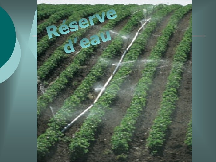 D-Les réserves d’eau ¡ Les réserves d’eau dépendent des précipitations et la conservation de l’humidité dans le sol. ¡ Le drainage et l’irrigation sont parfois nécessaires.
