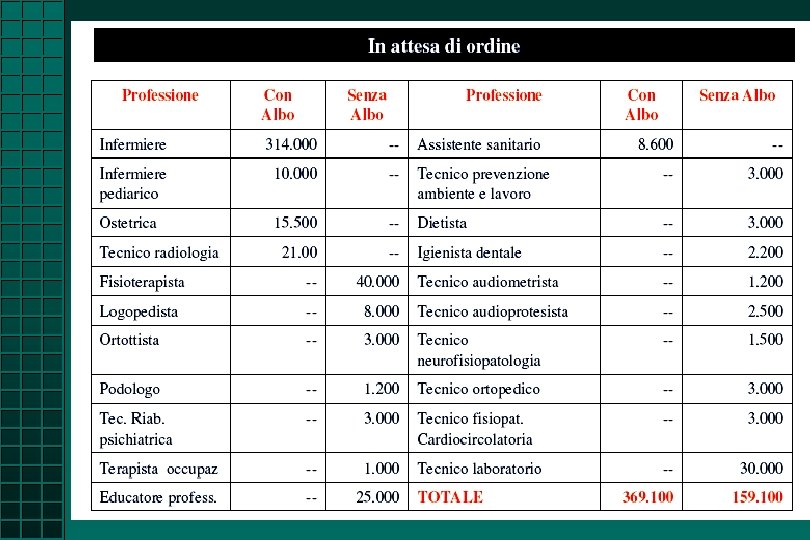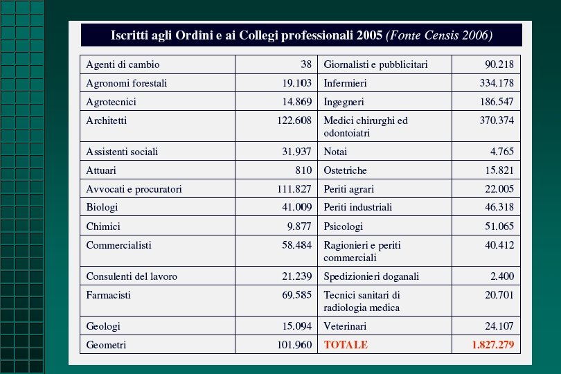 LE PROFESSIONI IN ITALIA • Professioni regolamentate per le quali non è prevista l’esistenza di ordini o collegi, ma per le quali l’attività è consentita solo a seguito di iscrizione in albi, registri ed elenchi tenuti da pubbliche amministrazioni o enti pubblici e l’iscrizione è subordinata al possesso di qualifiche professionali o all’accertamento delle specifiche professionalità • Professioni regolamentate per le quali non è prevista l’iscrizione, subordinata al possesso di qualifiche professionali o all’accertamento delle specifiche professionalità, in albi, registri ed elenchi tenuti da pubbliche amministrazioni o enti pubblici. • Professioni non regolamentate