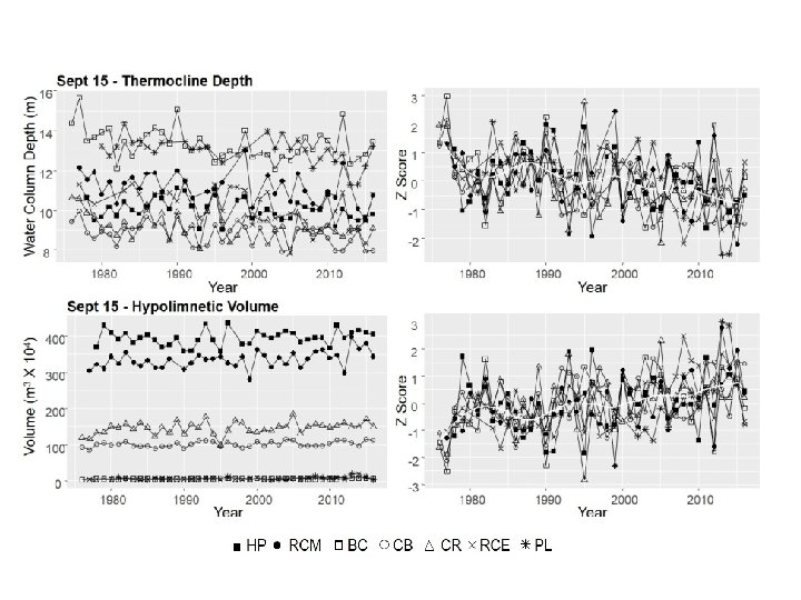 Coherency Analysis Sept-15 VWHO Sept-15 Mean Sept-15 Hypolimnetic Sept-15 Thermocline hypolimnetic [DO] Volume Depth ri 0. 58 (p < 0. 01) 0. 54 (p < 0. 01) 0. 35 (p < 0. 01) 0. 40 (p < 0. 01) Notes Excluding Plastic Excluding Chub Higher temporal coherence for oxygen trends compared to volume trends shallowest lake (16. 3 m) highest DOC concentration