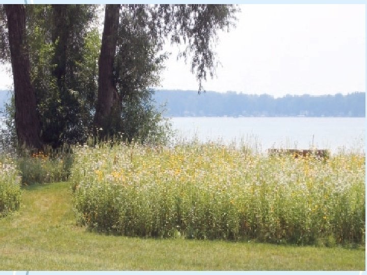 Buffer Zone Ø Definition l Ø Is a natural strip of vegetation along at least 75% of a property frontage Vegetation used to create a buffer zone l l l Native trees Shrubs Wildflowers (forbs) Grasses Sedges on land Emergent, floating and submergent aquatic plants