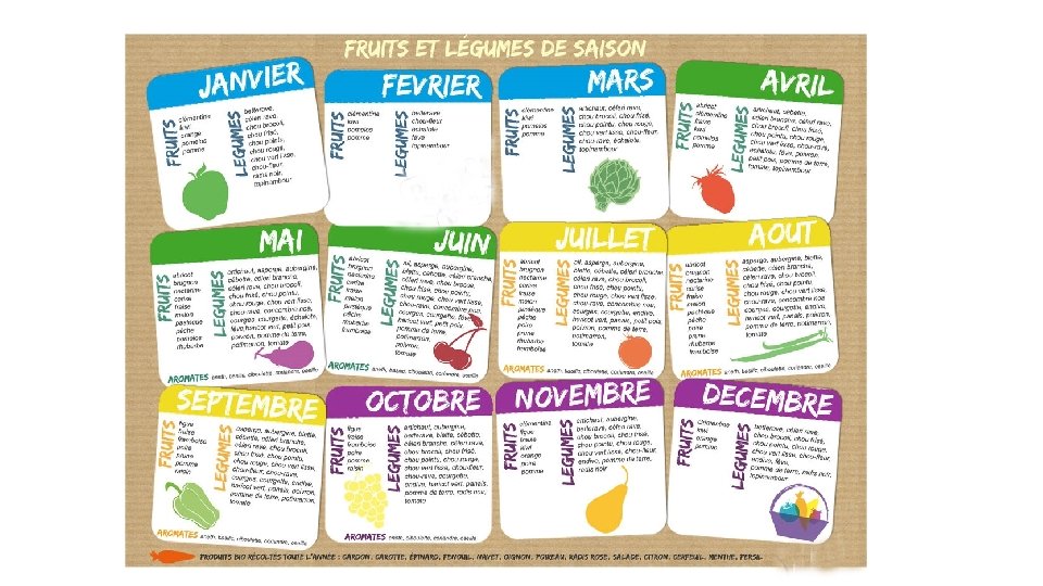 FRUITS & LEGUMES Pourquoi consommer des fruits et légumes ? Riches en vitamines, minéraux et fibres: primordial pour la santé Ils ont un rôle important dans la prévention des maladies comme des cancers, maladies cardio-vasculaires, l’obésité, le diabète… ATTENTION Les jus de fruits ne sont pas comptés comme des fruits et sont très sucrés et pauvres en fibres → pas plus d’un verre/j et privilégier un fruit pressé à la place. Yaourt ou biscuit aux fruits → n’est pas égal à un fruit car infime partie de fruits présente