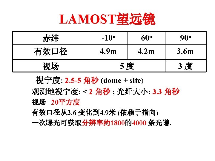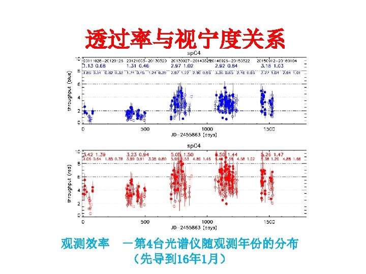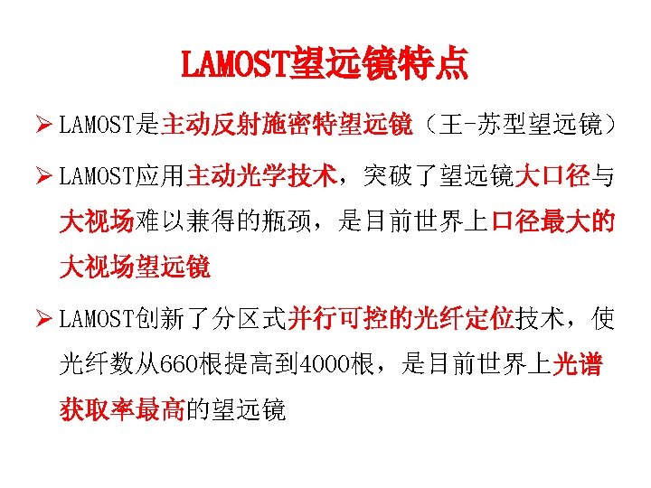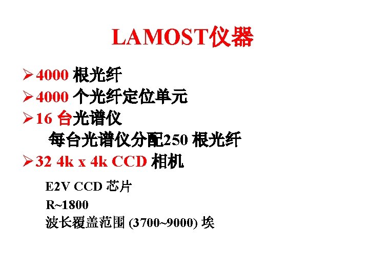 LAMOST NAOC 7 13 2016 Structure of LAMOST Slides: 21 Download presentation LAMOST 观测情况 施建荣(NAOC) 7. 13 2016 Structure of LAMOST 4000 Fiber Positioning MA mirror 5. 72 m× 4. 4 m 4000 F ibers MB mirror 6. 67 m× 6. 05 m 16 Spectrographs 32 CCDs MB 6. 67 m× 6. 05 m 焦距 20 m 37块子镜 MA 5. 72 m× 4. 4 m (24 块子镜) 视宁度 (2015 -2016) DIMM与导星星象(2015. 9 -2016. 6) 视宁度 Comparing the seeing from guide star and DIMM. 透过率与光纤的关系 效率与光纤的关系 A B C D E Pilot Regular 1 st Regular 2 nd Regular 3 rd Regular 4 th 死光纤: 83 (2. 1%) 140 (3. 5%) 166 (4. 2%) 233 (5. 8%) 228(5. 7%) 效率低: 315 (7. 9%) 448 (11. 2%) 488 (12. 2%) 524 (13. 1%) 339(8. 5%) 效率偏: 1211 (30. 3%) 1202 (30. 1%) 424 (10. 6%) 489 (12. 2%) 457(11. 4%) 效率高不稳定 21 (0. 5%) 1 (0. 0%) 81 (2. 2%) 86 (2. 2%) 113(2. 8%) 效率高: 2370 (59. 3%) 2209 (55. 2%) 2841 (71. 0%) 2668 (66. 7%) 2863(71. 6%) 观测计划(Plate) 依赖与观测条件 240 分钟 (可观测时间), 天气, 月相和视宁度 VB plates (9. 0<r<14. 0) 3*10 minutes B plates (14. 0<r<16. 3) 3*25 minutes M plates (16. 3<r<17. 8) 3*30 minutes F plates (17. 8<r<18. 5) 3*30 minutes readout ( 4 minutes) 巡天结果 先导: 第一年: 第二年: 第三年: 第四年: plates Observed times(h) 397 914 768 1278 697 1356 711 1413. 5 763 1456 观测的Plates GAC All DR 1 B: 76 DR 2 B: 75 DR 3 B: 227 DR 4 B: 227 M: 30 F: 4 M: 44 M: 167 M: 191 F: 1 Thank You!