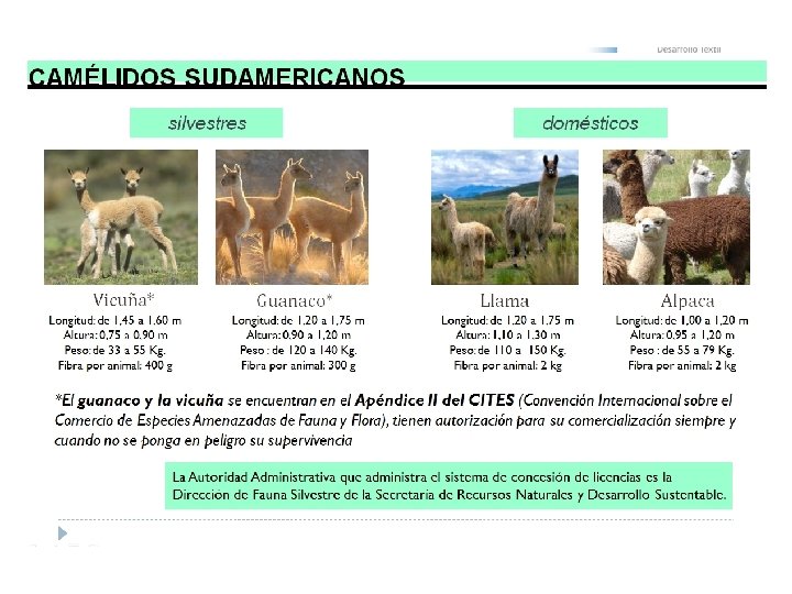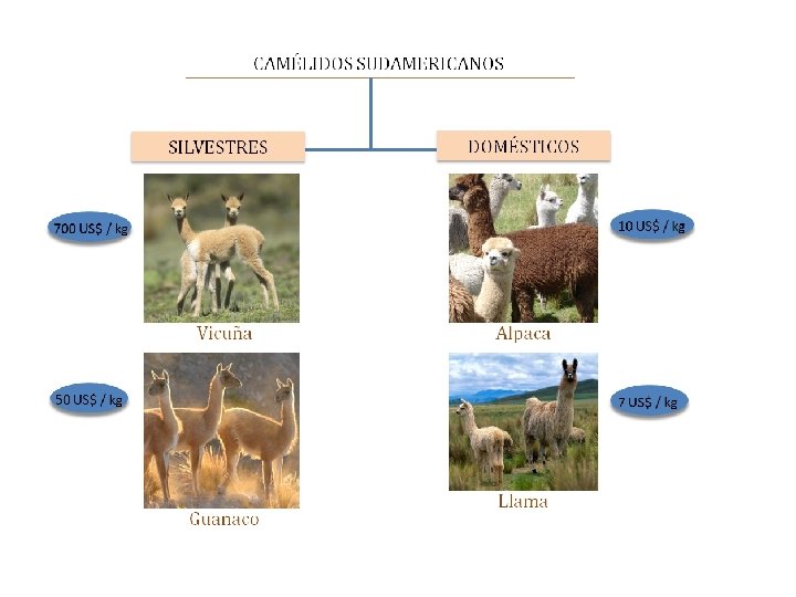 Alpaca Podemos encontrar diferentes tipos de Alpaca: huacayo (80% del total) , suri ( sedosa, fibras largas) y dos mulas ( huarizo y misti)