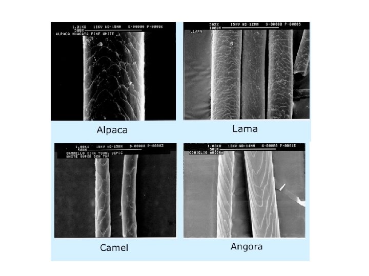 Vicuña Mayor frecuencia de escalas y surcos axiales caracteristicos (estrias) Alpaca/llama Las cutículas son casi cilíndricas márgenes estrechos y ondulación perpendiculares al eje de la fibra.