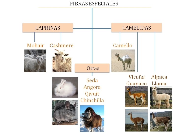 Fibras especiales El pelo de algunas especies de mamiferos ( además de la oveja) como cabras, bovinos, camelidos y conejos también podrían llamarse lana. Estas fibras conocidas como “ fibras lujosas” ( fibras especiales) siendo utilizadas para vestimenta de gran calidad.