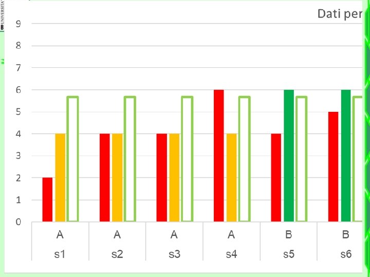 Rosso : osservazione per individuo Giallo o verde o viola: media del gruppo Bianco bordato di verde: media totale