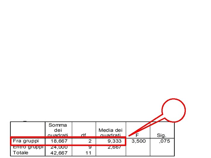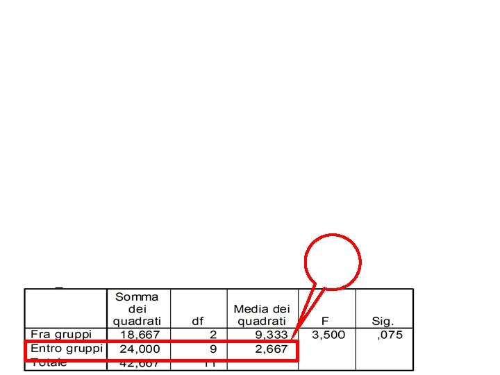 stud gruppo N media esami medie gruppototale scarto dalla media totale quadrato nei gruppi fra scarto dal gruppo quadrato scarto gruppo dal totale quadrato s 1 A 2 4 5, 67 -3, 67 13, 44 -2 4 -1, 67 2, 78 s 2 A 4 4 5, 67 -1, 67 2, 78 0 0 -1, 67 2, 78 s 3 A 4 4 5, 67 -1, 67 2, 78 0 0 -1, 67 2, 78 s 4 A 6 4 5, 67 0, 33 0, 11 2 4 -1, 67 2, 78 s 5 B 4 6 5, 67 -1, 67 2, 78 -2 4 0, 33 0, 11 s 6 B 5 6 5, 67 -0, 67 0, 44 -1 1 0, 33 0, 11 s 7 B 7 6 5, 67 1, 33 1, 78 1 1 0, 33 0, 11 s 8 B 8 6 5, 67 2, 33 5, 44 2 4 0, 33 0, 11 s 9 C 5 7 5, 67 -0, 67 0, 44 -2 4 1, 33 1, 78 s 10 C 7 7 5, 67 1, 33 1, 78 0 0 1, 33 1, 78 s 11 C 8 7 5, 67 2, 33 5, 44 1 1 1, 33 1, 78 s 12 C 8 7 5, 67 2, 33 5, 44 1 1 1, 33 1, 78 68 68 68 0, 00 42, 67 0 24 0, 00 18, 67 somma ----gradi di liberta ------ varianza 11 9 3, 88 2 2, 67 9, 33