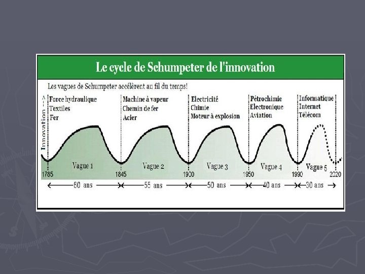 L’entrepreneur et l’innovation au cœur des cycles ► L’entrepreneur schumpétérien est un entrepreneur innovateur qui brise la routine, prend des risques, est créatif et innovant, il est au cœur de l’évolution du capitalisme ( Ford, Krupp, Edison, bell, Bill Gates. . . ) ► L’innovation et la destruction créatrice : l’innovation provoque l’apparition de nouvelles activités et la disparition d’activités, « le neuf chasse l’ancien » ( le nucléaire provoque la fin des charbonnages, l’informatique chasse la machine à écrire, la diligence est chassée par le chemin de fer…)