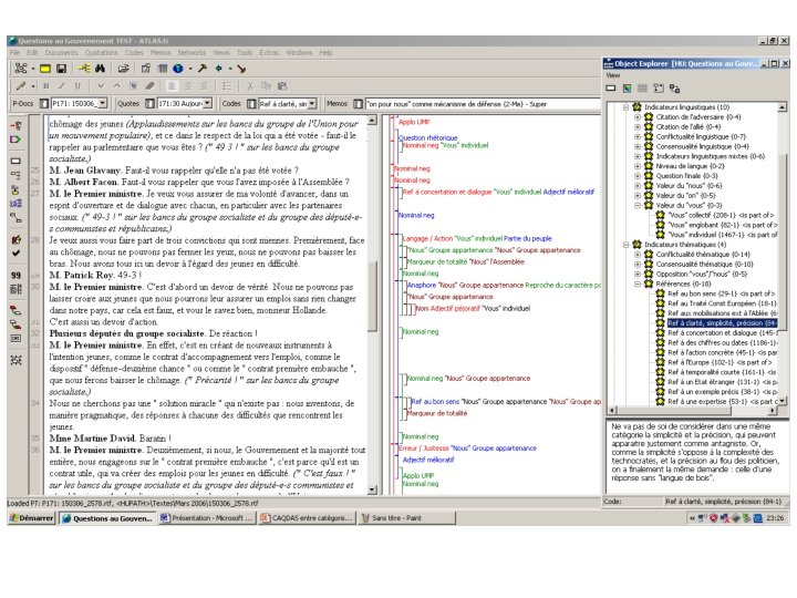 II- Une tension méthodologique intrinsèque 4 - Dans tous les cas : structurer l’information Quelle que soit la méthodologie utilisée, in fine, les CAQDAS permettent de structurer, indexer, référencer et commenter des corpus très étendus. Il s’agit peut-être, au fond, de leur utilité principale. En ce sens, presque toute recherche qualitative peut tirer les plus grands bénéfices d’un traitement par CAQDAS.