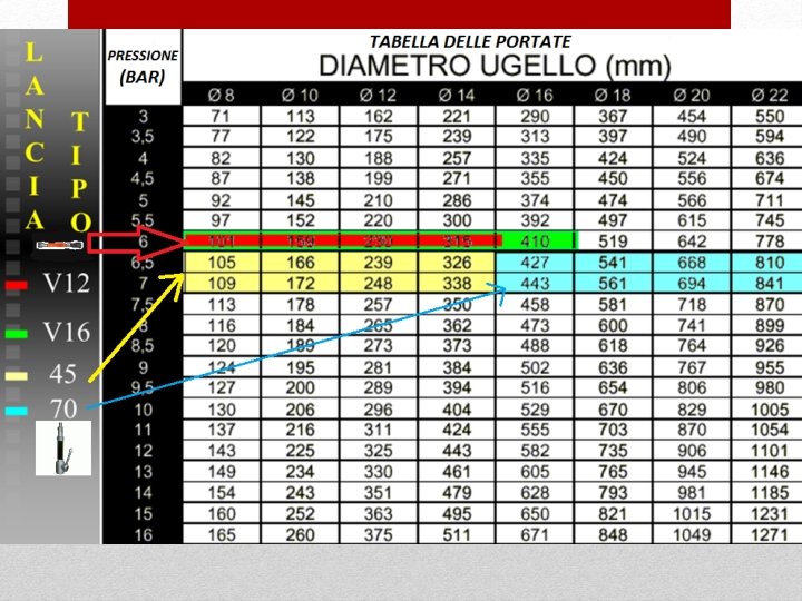 LANCIA A 2 VIE Lancia a PORTATA FISSA Pressione max. : 15 bar Pressione d’esercizio: 2/5 bar Portata UNI 45 (bocchello 9/12 mm): 150 -200 lt/min Portata UNI 70 (bocchello 16/22 mm): 400 -800 lt/min Gittata 12 mm: -Getto Pieno 25 mt, Getto Frazionato 15 mt Gittata 16 mm: -Getto Pieno 35 mt, Getto Frazionato 15 mt