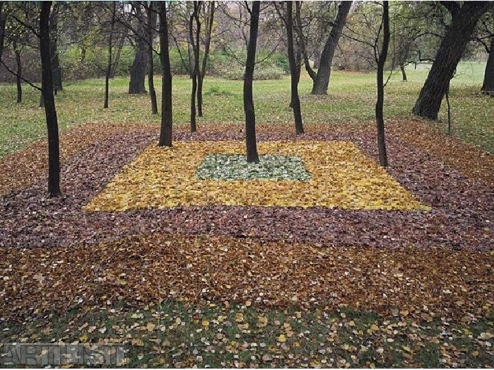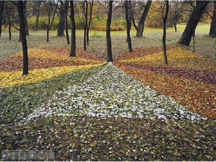 Český umělec Land artu Ivan Kafka (1952) • Předmětový repertoár se u Kafky inovuje celkem nepatrně. Z věcí, které kdy měly v jeho instalacích zásadní význam, lze namátkou vzpomenout spadané listí, sníh i led, písek, kámen či jiné přírodniny, špejle, větrné rukávce, šípy, dělové koule, nárazníky železničních vagónů nebo rovněž různě pestré větrníky, s nimiž autor pořádá své specificky konfrontační situace vlastní nebo i městské "přírody". Dílo na následujícím stránce s názvem „Lesní koberec pro náhodného houbaře“ a inspirace tímto dílem provedená při hodině VV.
