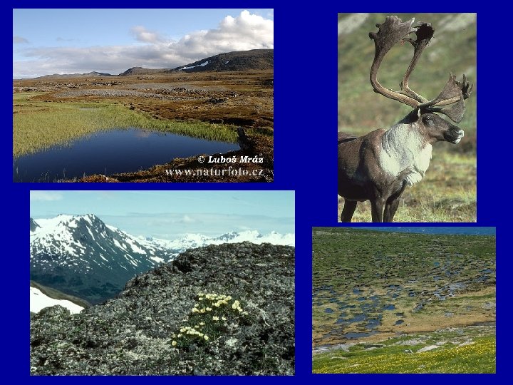 Tundra Brain bop on Tundra • Tundra video • Review Video of all 6 land biomes. • Climate: very cold, little precipitation, snow on the ground all but two months of the year. • Consumers: reindeer, arctic foxes, wolves, snowy owls, hawks, eagles, falcons, lemmings, voles, marmots, mosquitoes, and flies. • Producers: during two summer months Mosses, grasses, shrubs, lichens NO TREES because the soil is frozen called permafrost. • Extra facts: very, very cold