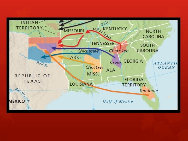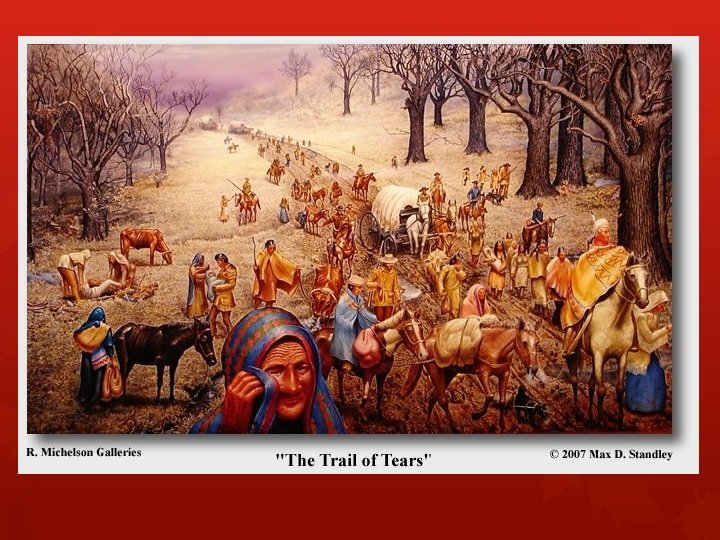 John Ross and the removal of the Cherokee • 1828 - Chief of Cherokees • Modeled the Cherokee Nation government after the US government • Tried to protect Cherokee lands • Protested Georgia’s land lottery and Indian Removal Act • Survived the Trail of Tears